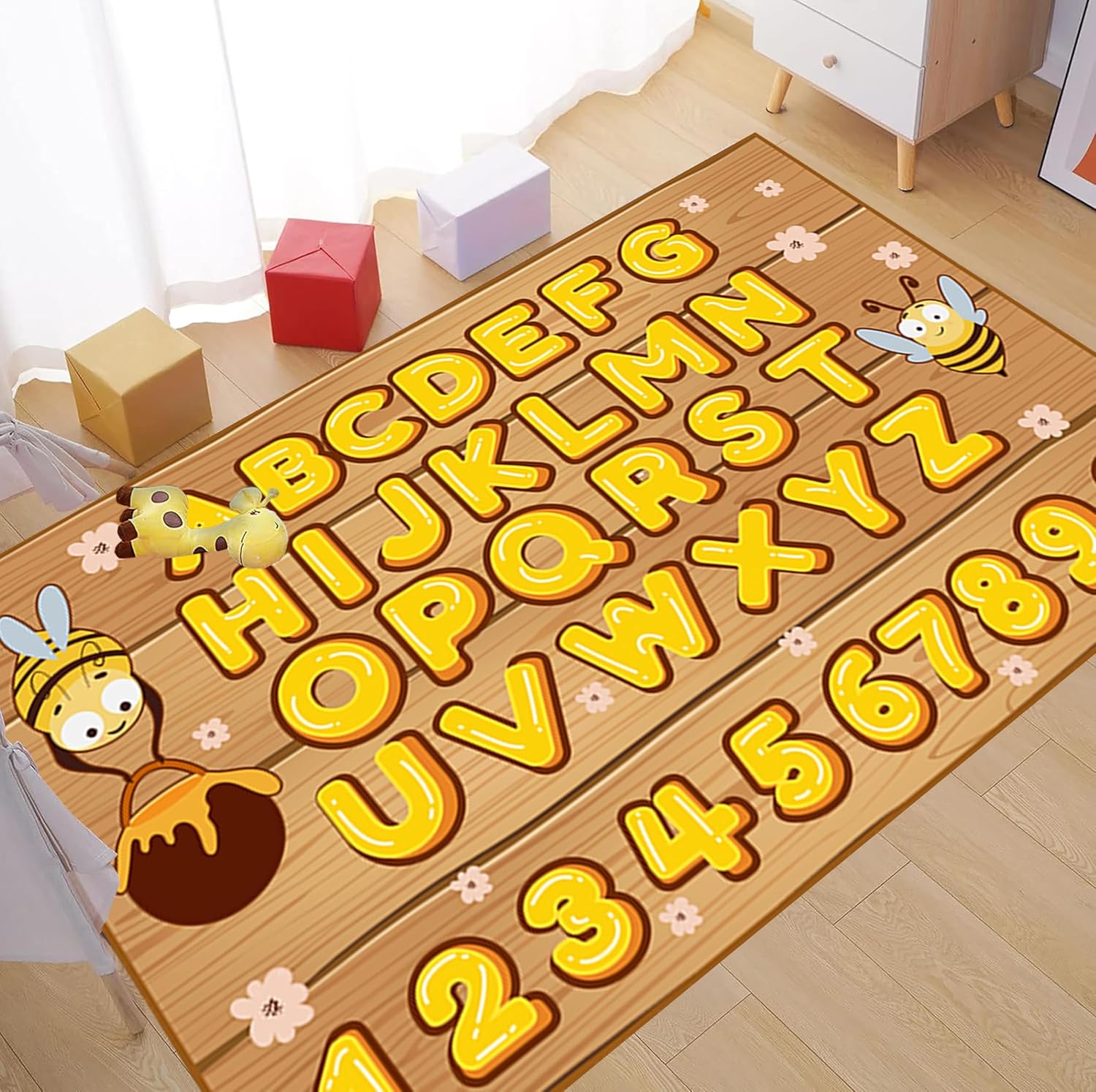 Yellow Bee Rugs for Kids Bedroom, 4x5ft, Wood Grain Cute Little Bee Daisy Honey Yellow Number Alphabet ABC Area Rug, Soft Fade Resistant Floor Mat for Classroom Play Room Study