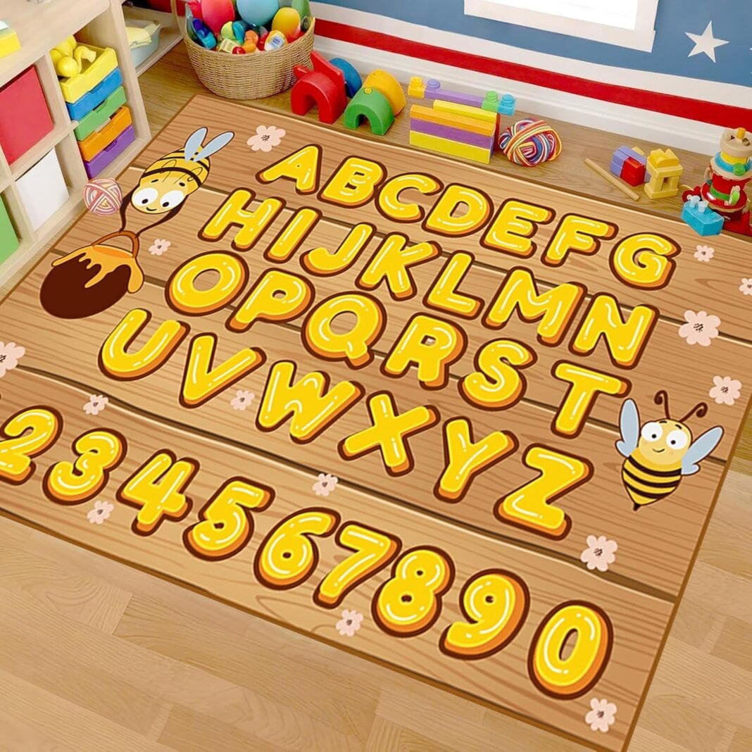 Yellow Bee Rugs for Kids Bedroom, 4x5ft, Wood Grain Cute Little Bee Daisy Honey Yellow Number Alphabet ABC Area Rug, Soft Fade Resistant Floor Mat for Classroom Play Room Study